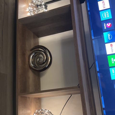 ovaalin mallinen sohvapöytä lasikannella, kirjahylly vitriinikaapilla ja hyllyillä sekä laatikostolla.
