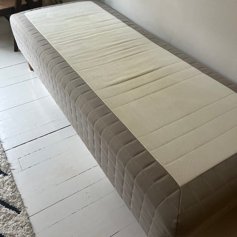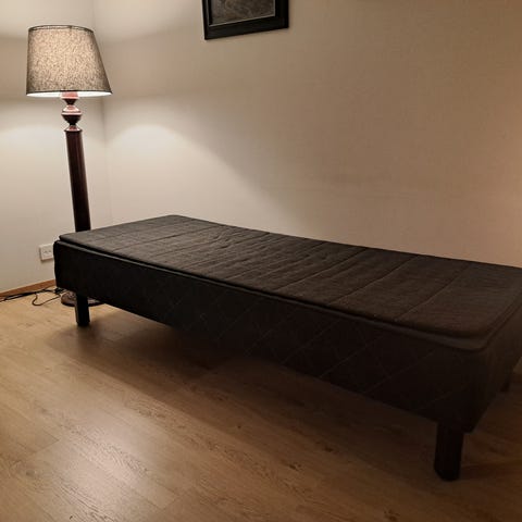 Jysk sängynrunko, jossa avattava säilytystila rungon sisällä. Rungon verhoilu on harmaa kangas. Säilytystilan pohja on levyä, joka soveltuu vuodevaatteiden ja muun kevyen tavaran säilyttämiseen. Tuote sopii käytettäväksi makuuhuoneessa tai vierashuoneessa erillisen petauspatjan kanssa. Petauspatjaa ei ole .Omat kantajat mukaan .