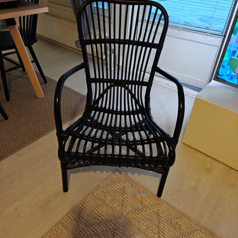 Myydään rottinkituoli mustalla pehmusteella. Tuolin jalat heikot, kestää istumista, mutta kannattaa sitoa kunnolla yhteen.