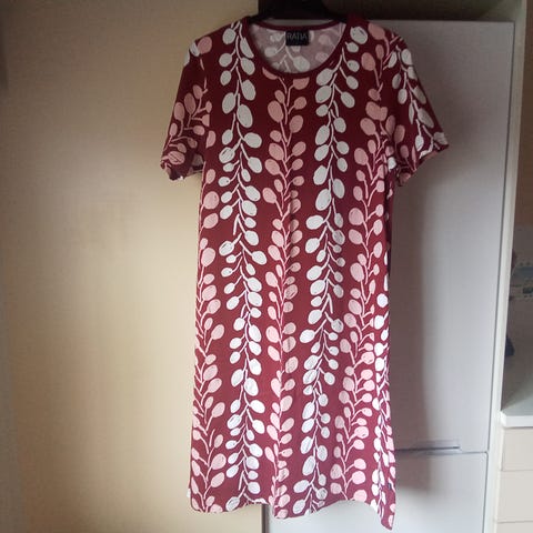 Koko L. 100% puuvilla. Kai-kai 57, olka-helma 115, VY: joustaa n. 85-90-100( nauhoilla kiristys). Päälletaskut. Mekko sidotaan edestä ja takaa. Musta/valko