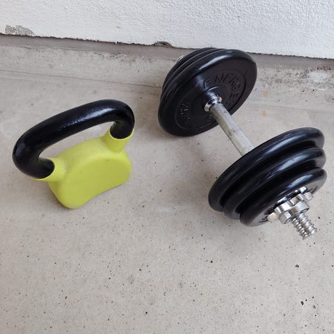 Käsipainosetti, johon kuuluu kaksi muovista kahvakuulaa 3kg ja 2.5kg sekä yksi vihreä käsipaino 1kg. Sopii kotiharjoitteluun ja lihaskuntoharjoituksiin eri lihasryhmille.Kaikki yht.10eur nouto Etu-Töölö käteismaksu.