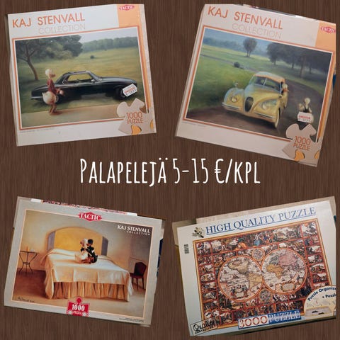 Myydään neljä tuhannen palan palapeliä, 5€/kpl. Pusseissa olevat ovat Kaj Stenvallin ”Tukevasti maalla” ja ”Pullon henki ja aine. Näin ainakin googletuksen mukaan, rasiat ovat muutossa hävinneet. Käytetyt, kaikki palat tallessa kaikissa neljässä.