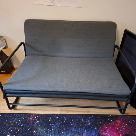 IKEA vuodesohva beige. Kolmen istuttava sohva, joka avautuu kahden hengen vuoteeksi. Päällinen on vaalean beigeä kangasta. Selkänoja taittuu alas muodostaen tasaisen nukkumapinnan. Sopii olohuoneeseen, vierashuoneeseen tai pieneen tilaan, jossa tarvitaan sekä istuma- että nukkumapaikkaa. Sängyn leveys 140.