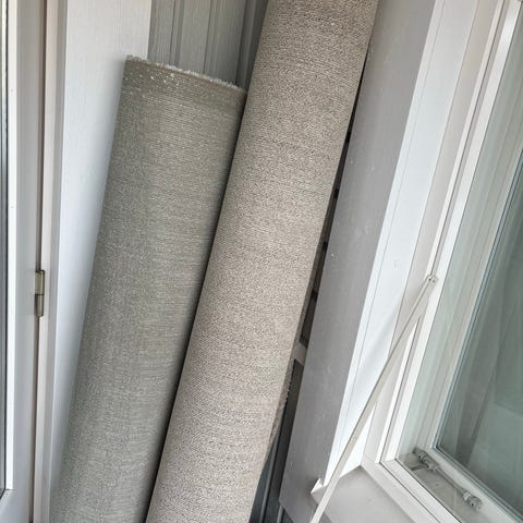Harmaa eläväpintainen nukkamatto muuton tieltä seuraavalle. Mitat: 200cm x 290cm