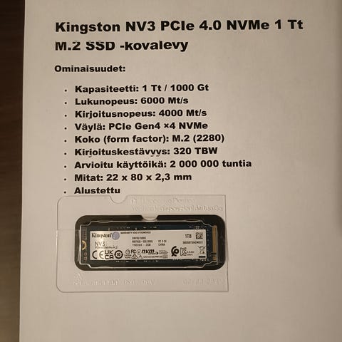 M.2 SSD-levy, joka sopii M.2-liitäntää tukeviin tietokoneisiin. Sopii käyttöjärjestelmän, ohjelmien ja tiedostojen tallentamiseen. Fyysinen koko ja liitinmuoto ovat M.2-standardin mukaiset. Soveltuu kannettaviin ja pöytätietokoneisiin, joissa on yhteensopiva M.2-paikka.Nouto