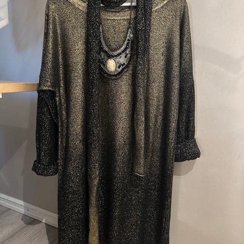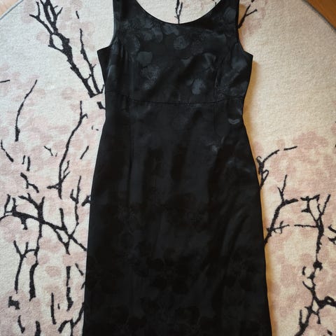 Musta mekko v-kaula aukolla, avoin selkä ja molemmilla puolilla halkiot helmassa. Mekon voi sitoa naruilla haluamallaan tavalla.