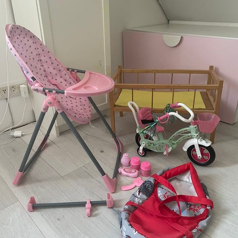 Tarvikesetti nukeille, sisältää syöttötuolin, matkasängyn, hoitolaukun ja ruokalapun.