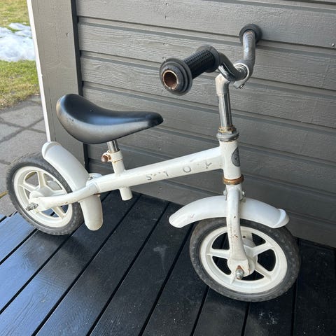 Stoy potkupyörä lapsille, 10" renkailla. Rungon väri musta ja vanteet vaaleat. Satula ja käsikahvat ovat mustat. Potkupyörä sopii tasapainon harjoitteluun ja pyöräilyn opetteluun pienille lapsille. Pyörässä on matala runko ja jalkatila, mikä helpottaa kyytiin nousua ja siltä laskeutumista. Pöyrässä on pintaruostetta (ehkä irtoaa ruosteenpoistoaineella) mutta täysin käyttövalmis ja jämäkkä
