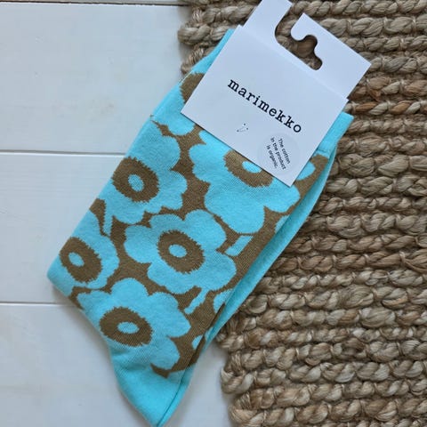 Marimekko sukat valkoista puuvillaa. Sukissa on Marimekon kukkakuosi ja logoteksti. Naisille suunniteltu malli, koko 40-42. Materiaalina puuvilla, joka tekee sukista pehmeät ja hengittävät jokapäiväiseen käyttöön.