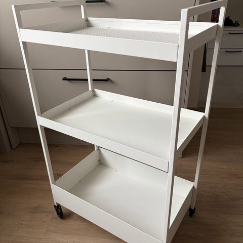 IKEA tarjoiluvaunu joka on ollut työkaluvaununa. Pari ylimääräistä reikää porattu säilytystasoihin. Tekee kuitenkin tehtävänsä.