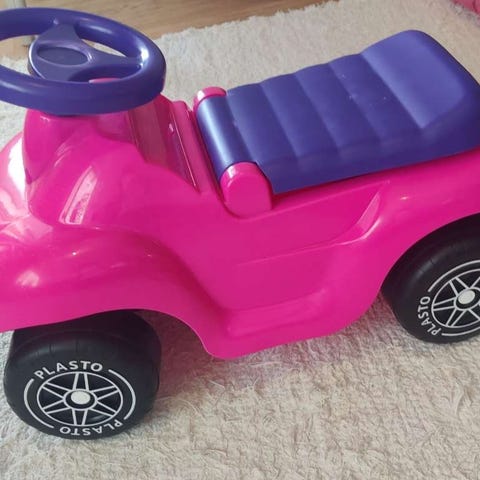 Plasto potkuauto lapsille. Nelipyöräinen malli, valmistettu kestävästä muovista. Väri keltainen, mustat pyörät.