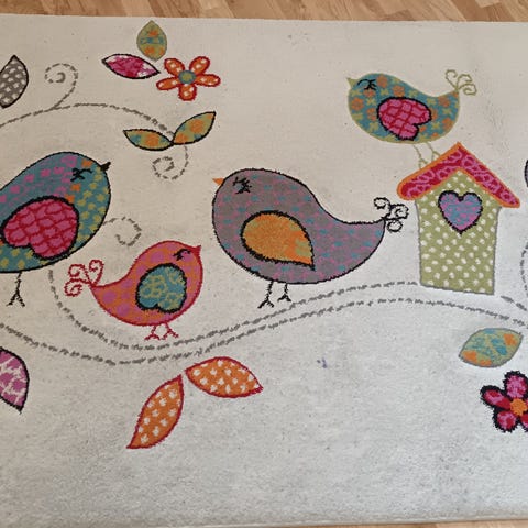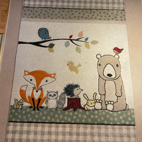 Merinos Diamond Forest Kids lasten matto, koko 120 x 170 cm. Matossa on metsäteemainen eläinkuviointi, jossa on muun muassa kettu, karhu ja muita eläinhahmoja sekä puu ja lehtiä. Pohjaväri on vaalea, reunoilla ruutukuviota ja alareunassa vihreä nurmikkokaistale. Pehmeä tiheä ja matala nukkamatto, joka tuntuu pehmeältä jalan alla. Soveltuu erityisesti lastenhuoneeseen tai leikkitilaan.