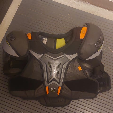 Bauer Supreme 1S harttarit jääkiekkoon, koko Sr XL. Värit musta, harmaa ja keltainen. Rintakehän suositusmitat noin 107–117 cm ja pituussuositus noin 180–190 cm.