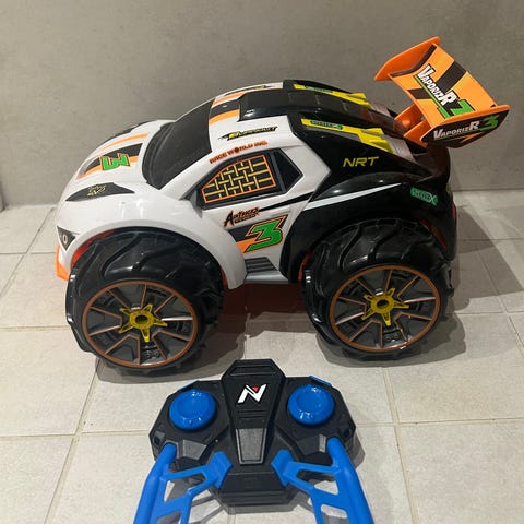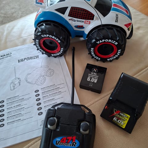 Nikko Nano Vaporizr radio-ohjattava auto. Pienikokoinen nelipyöräinen ajoneuvo, jossa on valkoinen kori punaisilla ja sinisillä kuvioilla sekä mustat renkaat sinisillä yksityiskohdilla. Mukana erillinen kauko-ohjain antennilla ja käyttöohje. Auto toimii 4 paristolla, vaihdettu juuri uudet. Auton pituus noin 18 cm. Nouto tai postitus.