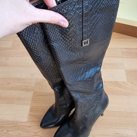 Uudenveroiset Högl pitkävartiset kiiltävät nahkasaappaat, koko 39 (sisämitta n. 24,5 cm). Vetoketju + varren suussa nauhat, väri musta, aitoa nahkaa, fleecevuori. Matala kanta ja tasainen pitävä kumipohja.