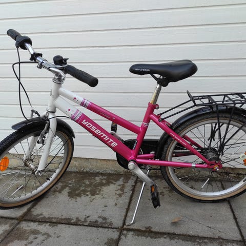 Lasten polkupyörä, jossa 20" renkaat. Rungon väri on musta ja vanteet siniset, etuhaarukassa vihreä yksityiskohta. Pyörässä on satula ja polkimet sekä lokasuoja takana. Sopii lapselle, joka käyttää 20 tuuman kokoista lastenpyörää arki- ja vapaa-ajan ajoon.