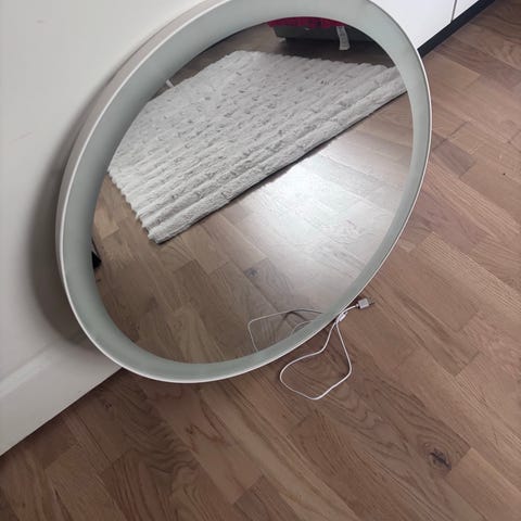Meikkipeili valoilla, mutta yksi lamppu mennyt rikki. Uusia saa ainakin Clas Ohlsonilta, josta peili alunperinkin ostettu. Muutoin ehjä ja siisti. Voi kiinnittää seinään tai laittaa pöydälle, takana ”jalka”. Koiratalous.