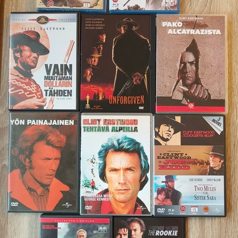 Clint Eastwood 3-Film Collection Blu-ray-elokuvasetti. Pakkaus sisältää kolme lännenelokuvaa: Pale Rider, The Outlaw Josey Wales ja Unforgiven. Formaatti on Blu-ray, ikäraja 15. Takakannen mukaan mukana on pohjoismaiset tekstitykset, mukaan lukien suomi.