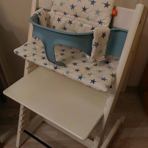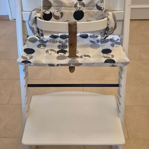Valkoinen stokke tripp trapp tuoli. Mukana valkoinen baby set, harmaa tarjotin, stokken lautanen ja pehmusteet.