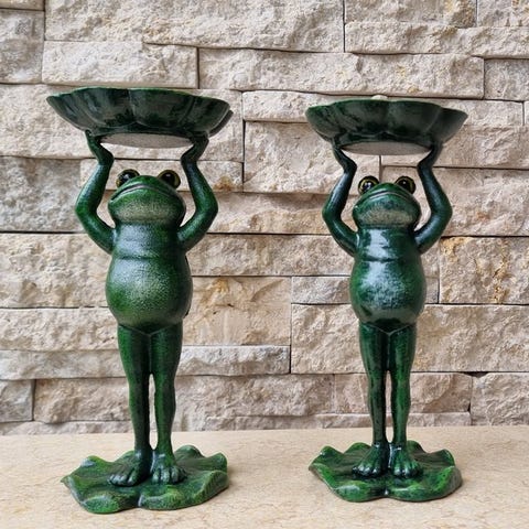 Ihana pari valurautaisia sammakoita, lintualtaita tai kynttilänpidikkeitä. Hieno puutarha- ja kodinsisustus. Setti kahdelle, jokaisella kappaleella on seuraavat mitat:Korkeus: 20 cmLeveys: 12 cmKaikki tuotteemme pakataan huolellisesti ja lähetetään vakuutettuna.