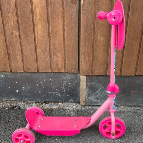 Lasten kolmipyöräinen potkulauta. Painoraja 20 kg. Jonkin verran kulunut ja metalliosissa hieman ruostetta, mutta täysin ehjä ja toimiva.