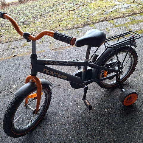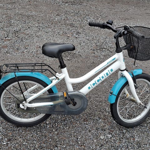 Occono lastenpyörä 16". Pyörässä on 16 tuuman renkaat, matala runko ja jalkatuki. Varusteluun kuuluu etukori, lokasuojat ja heijastimet. Väri on sininen turkooseilla yksityiskohdilla.