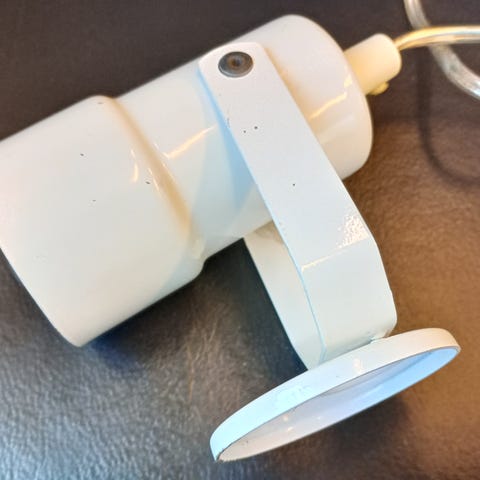 Valkoinen Lampukas 22457 seinävalaisin arviolta 70-luvulta. Virheetön maalipinta. Pituus noin 20 cm. Halkaisija 13 cm. Lampun kanta E27.