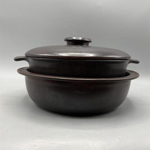 Sininen Arabian valmistama keraaminen kattila, jossa on litteä kansi. Kattilan ulkopinta on tasainen ja siinä on yksinkertainen muotoilu.