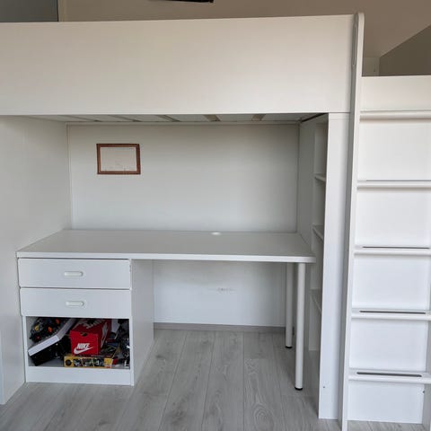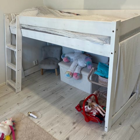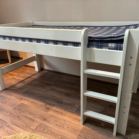IKEA parvisänky metallinen, harmaa. Korkea sänky, jossa tikkaat ja tilaa esimerkiksi työpisteelle tai säilytykselle sängyn alla. Runko metallia, värinä harmaa. Sopii yhden hengen patjalle (normaali yhden hengen sängyn leveys).