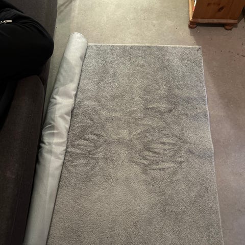 Askosta kaksi vuotta sitten ostettu valkoharmaa matto. Pehmeä ja mukava jalan alla, kulmat pysyvät hyvin alhaalla. Tummentumaa molemmilla reunoilla, en ole koittanut puhdistaa. Imuroitu säännöllisesti ja raikastettu soodalla. Kunto huomioitu hinnassa.