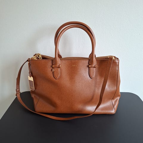 Ralph Lauren nahkainen naisten käsilaukku ruskeaa nahkaa. Laukussa on kaksi kantokahvaa ja avoin päälokero, jonka sisällä on jaoteltuja taskuja ja väliosio tavaroiden järjestelyyn. Pohjassa on metallinastat, jotka suojaavat laukkua pinnalle laskettaessa. Sopii arjen käyttöön ja työ- tai asiointilaukuksi, johon mahtuu esimerkiksi lompakko, puhelin ja pieniä henkilökohtaisia tavaroita.