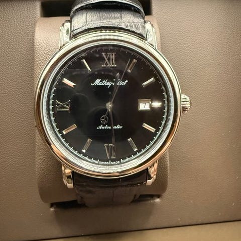 Mathey-Tissot H9030ABU – automaattinen – sininen kellotaulu – Sveitsissä valmistettuMathey-Tissot H9030ABU on tyylikäs ja hienostunut sveitsiläinen automaattikello, suunniteltu niille, jotka arvostavat klassista kellontekoa modernilla vivahteella. Tämä malli on varustettu vaikuttavalla auringonlähdön kaltainen sininen kellotaulu, jota korostavat ruusukullan sävyiset applikoidut indeksit ja roomalaiset numerot, luoden hienostuneen kontrastin. Samanvärinen sininen nahkaranneke viimeistelee harmonisen kokonaisuuden, tehden kellosta ihanteellisen sekä viralliselle että smart-casual-tyyliin.Luotettavalla automaattitoiminnolla varustettu kello yhdistää perinteisen käsityön ja nykyaikaisen estetiikan. Kolmen osoittajan päivämääräikkuna lisää käytännöllisyyttä säilyttäen siistin kellotaulun asettelun.Tila: Uusi, käyttämätönLiike: Automaatio (itsevetoinen)Toiminnot: tunnit, minuutit, sekunnit, päivämääräKotelon materiaali: ruostumaton teräs ruusukullan sävyisellä viimeistelylläRanneke: Sininen nahkaranneke soljullaKellotaulu: Auringonlähteen kaltainen sininen kellotaulu ruusukullan sävyiset applikoidut indeksit ja roomalaiset numerotLasi: SafiirilasiVesitiiviys: 5 ATM (50 metriä)Kellon muoto: PyöreäTyyli: Klassikko / juhlakelloAlkuperä: Sveitsissä valmistettuMukana: Alkuperäinen Mathey-Tissot-esittelylaatikko ja kansainvälinen takuuTullit ja verot: Tullimaksut ja paikalliset verot voivat tulla sovellettaviksi sen mukaan, miten maasi säädökset määräytyvät. Nämä maksut ovat ostajan vastuulla. Tarkista paikalliset tullivaatimukset ennen ostopäätöstä.