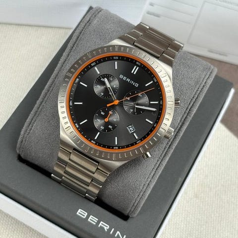 Kaunis miehille suunnattu kello Beringiltä, referenssinumerolla 11743-727. Kellossa on urheilullinen ilme ja se on erittäin mukava kantaa kevyen titanium-rannekkeen ja -kotelon ansiosta. Lisäksi sen luettavuus on hyvä taustan ja indeksien välisen kontrastin ansiosta. Varustettu kronografilla ja päivämääränäytöllä kellotaulun 4:n position kohdalla. Glass on safiirilasi. Uusi ja käyttämätön!Toimitetaan näytettyjen lisävarusteiden ja (tyhjien) asiakirjojen kanssa.Koneisto: kvartsikoneistoKotelon materiaali: titaaniläpimitta: noin 43 mm ilman kruunuapaksuus: 10 mmranneke: noin 21 cm. sisältäen kellon.Ikä: 2020+Toimitetaan vakuutettuna.Kuvat kuuluvat kuvaukseen.