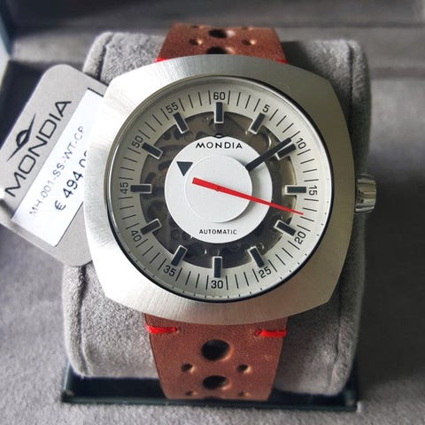 Mondian merkkinen huomionarvoinen herrakello. Kellon voimanlähteenä on automaattinen koneisto (kal. NH72a) ja siinä on huomionarvoinen skeletoidun kellotaulun, jossa automaattinen koneisto näkyy sekä takaa että edestä. Kellon runko on näyttävän vintage-henkinen, harjattujen aksenttien kanssa.Kello sijaitsee mukavalla teräksisellä rannekkeella.Kellon mukana toimitetaan näkyvät (valkoiset) tarvikkeet.Koneisto: automaattinen (kal. NH72a)Kotelon materiaali: teräsdiameter: noin 40 mm ilman kruunuarannekkeen pituus: noin 19 cmIkä: 2020+Lähetys on vakuutettu.Kuvat ovat osa kuvausta.