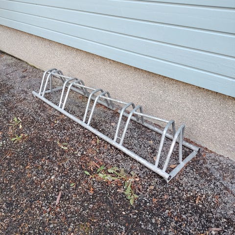 Metallinen polkupyöräteline ulkokäyttöön. Teline koostuu peräkkäisistä rengaskiinnikkeistä, joihin polkupyörän etupyörä asetetaan. Soveltuu usean polkupyörän pysäköintiin piha- tai pihatiealueella. Materiaali on metallia, joka on tarkoitettu ulko-olosuhteisiin.