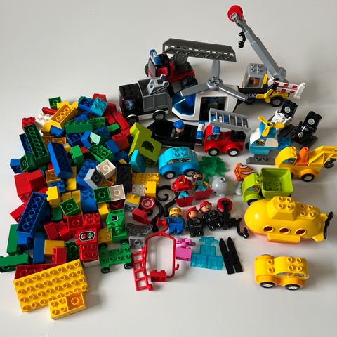 LEGO dupplo rakennuspalikat ja junaradan osat. Kuvassa näkyy sekalainen kokoelma erilaisia dupploja. Junan veturi toimii (paristot), runsaasti junaradan osia