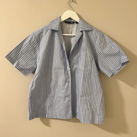 Marimekko x Uniqlo raidallinen paita, jossa napit edessä. Sivuilla pienet halkiot. Värit tummansininen ja valkoinen.
