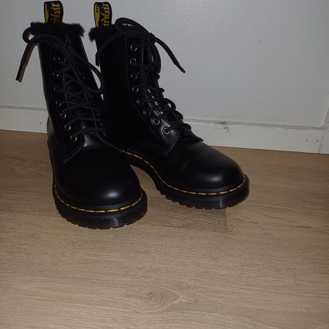 Pari vuotta vanhat Dr. Martensit, joissa karvavuori. Koko 36, pohja sisältä mitattuna 23 cm