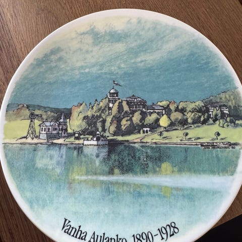 Lautanen on pyöreä ja siinä on värillinen maisemakuva järvimaisemasta ja rakennuksista. Sopii käytettäväksi koriste-esineenä esimerkiksi seinälle ripustettavaksi tai kokoelmaan liitettäväksi.