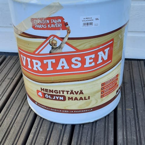 Avattu, mutta ei kulutettu. Tällä maalaa pinnasta riippuen n. 108-180m2. Oli syksyllä ennen pakkasten tuloa ulkosäilytyksessä, siksi hapettumaa astian ulkopinnoilla. Tavara on kunnossa.