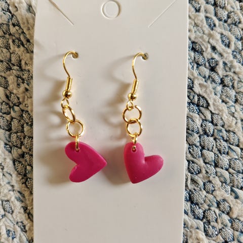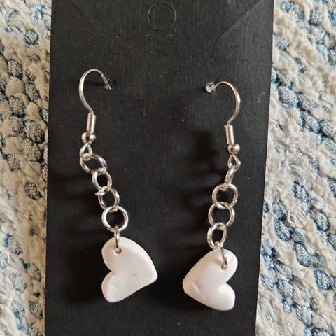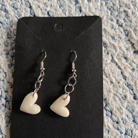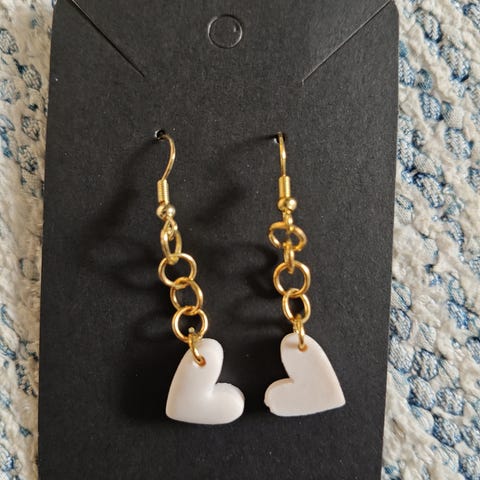 Kuvassa olevat uudet, käsityönä valmistetut kullan väriset korvikset luonnonvalkoisella valkoisella ja pimeässä hohtavalla sydämellä, nyt yrityksen lopettamisen myötä poisto myynnissä.