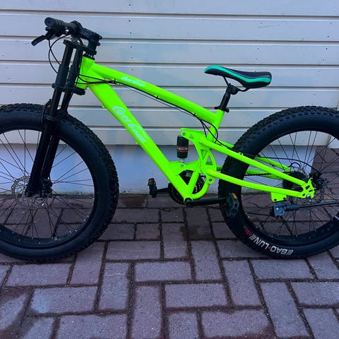 Lasten fatbike-polkupyörä, jossa 24" renkaat. Rungon väri on sininen ja vanteissa on vihreät pinnat. Leveät renkaat soveltuvat ajoon erilaisilla alustoilla, kuten hiekkateillä ja poluilla. Pyörä on mitoitettu lapselle, ja kuvissa näkyy perusvarusteltu maastokäyttöön sopiva runkorakenne.