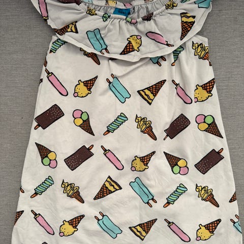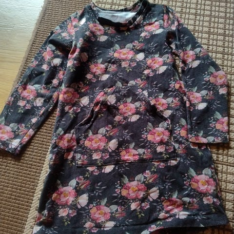 Siuatikuntoinen trikoomekko arkeen. Frillat olalla, eläinkuvioita. Nouto Lahden Anttilanmäeltä tai postitus.