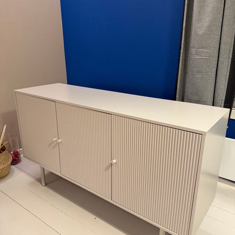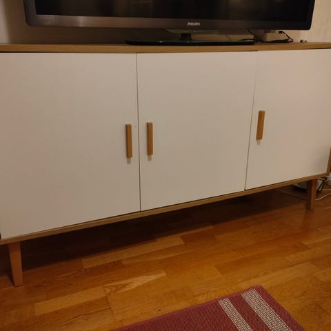Jysk Aage Petersen senkki vaaleaa puuta(150 *76 * 40 cm). Kolme etuovea 50 cm, joiden takana hyllytilaa säilytykseen. Puupinta kuviollinen ja jalat kapeat, mikä jättää lattiatilan näkyviin. Soveltuu esimerkiksi olohuoneeseen säilytyskalusteeksi tai tv-tasona käytettäväksi.