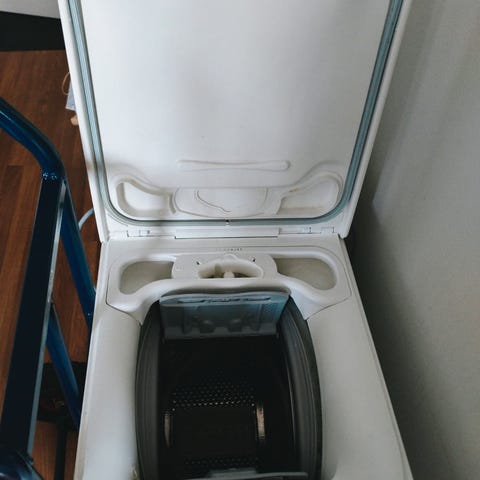 Toimiva Indesit pyykinpesukone. Yksi tukijälkä pohjalta puuttuu.
