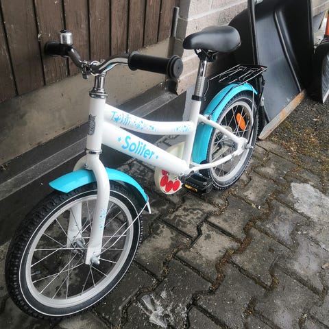 Väri on vaaleanvioletti. Pyörässä on jalkajarru ja käsijarru edessä. Soveltuu n.4–6-vuotiaalle. Paino: 7,1 kg. Täysin ehjä ja valmiina ajoon. Melkein kuin uusi, mutta käytön jälkiä toki löytyy jos tarkasti katsoo.