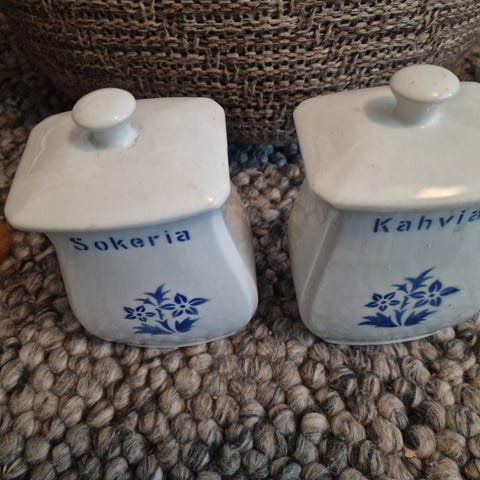Arabia purkki puukannella. Purkki on keramiikkaa ja siinä on sininen koristekuvio valkoisella pohjalla. Kansi on puuta. Sopii esimerkiksi keittiön säilytykseen, kuten kuivatuotteille tai pientarvikkeille.