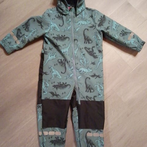 Hyväkuntoinen Peuhun välikausihaalari. Vihreä, jossa dinokuvioita. Toinen jalkalenksu puuttuu. Peppu ehjä ja polvet myös. Polvissa hieman karheumaa. Softshell materiaalia.