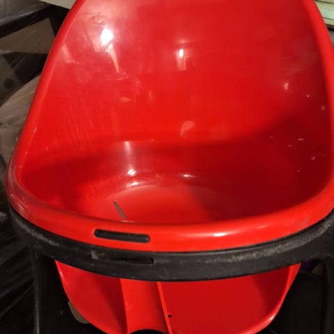Stokke syöttötuolin vauvan istuinosa. Vaalea, pehmustettu istuin, jossa on turvavaljaat. Taustapuolella tuuletusaukot ja kiinnitysmekanismit Stokke-syöttötuoliin. Soveltuu pienelle lapselle syöttötuoliin asennettavaksi erilliseksi istuinosaksi.