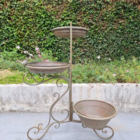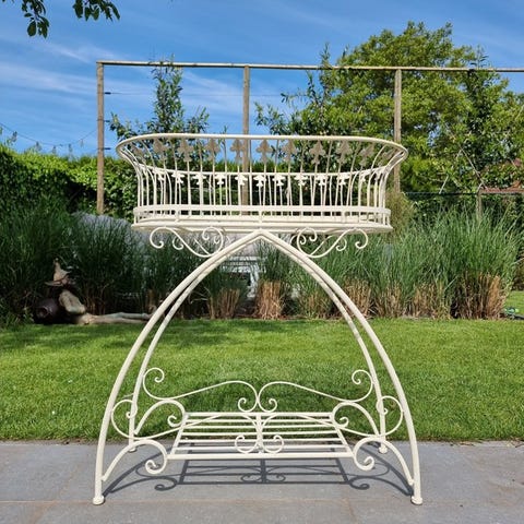Rautainen kukka-alusta, jossa kolme pyörää. Halkaisija noin 28cm.